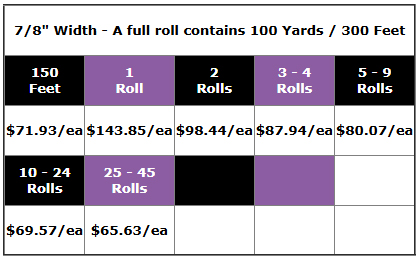 | 7/8" Width - A full roll contains 100 Yards / 300 Feet | ||||